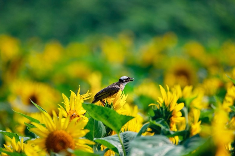 圖片于近日攝于襄城縣首山。成片的向日葵長得茁壯,綻開著一朵朵金黃色的花,鳥兒在上面淡然歇息。 晨報攝友 楊望祥 攝