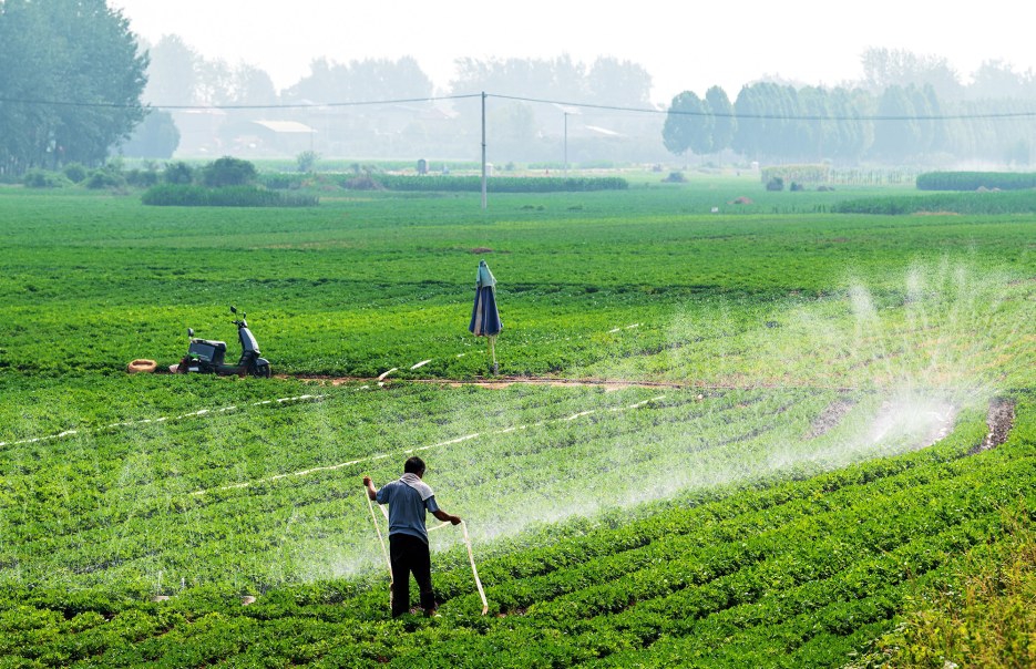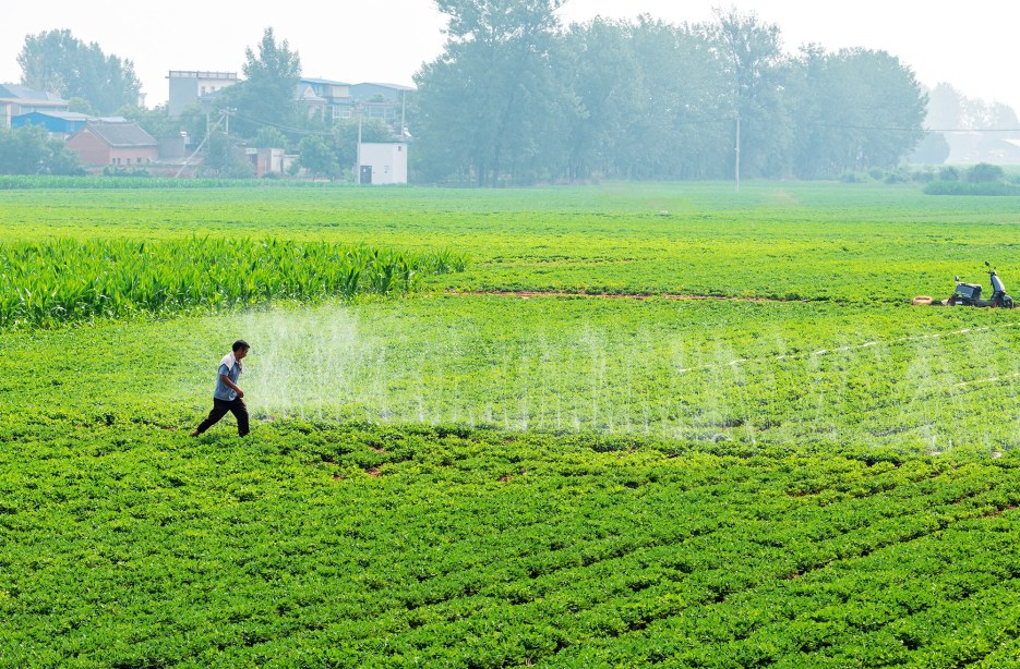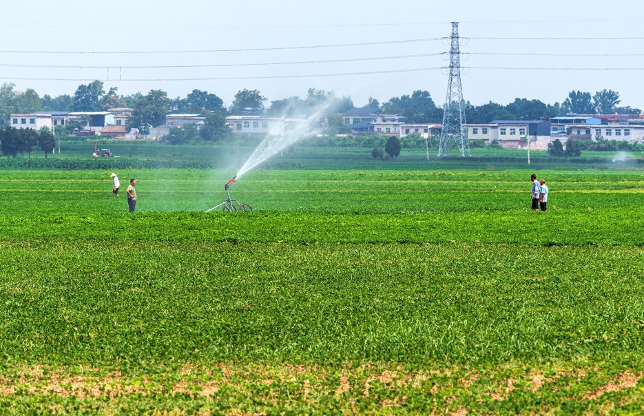 7月15日,襄城縣丁營鄉(xiāng)榆孫村村民在給花生田澆水。