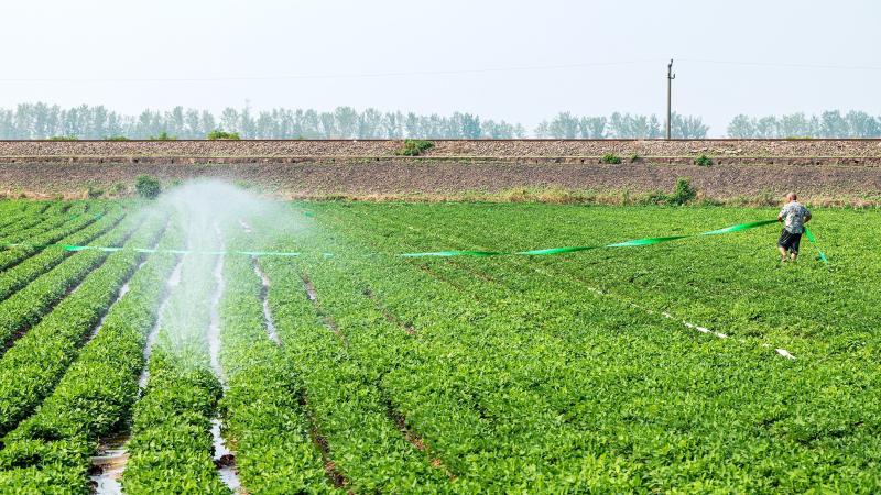 7月15日,襄城縣丁營鄉(xiāng)榆孫村群眾利用噴灌設(shè)備為花生田澆水抗旱。