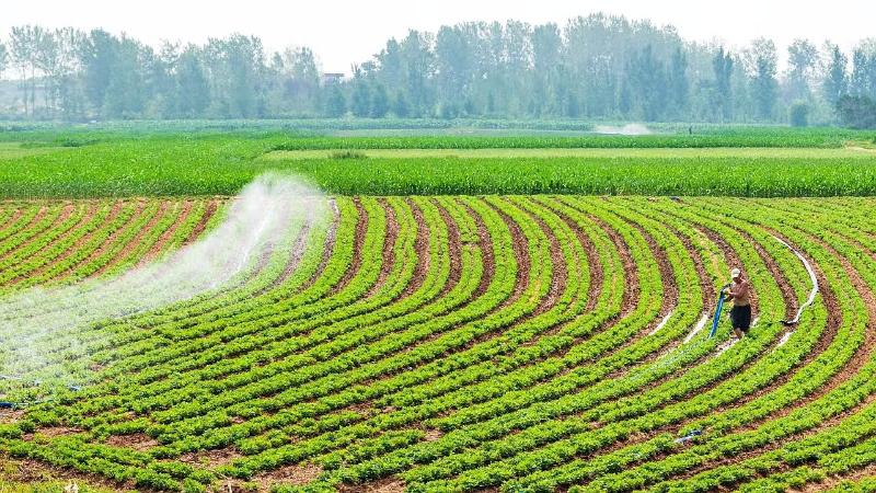 7月12日,襄城縣麥嶺鎮(zhèn)歐營村群眾利用微噴管為花生田和玉米田澆水抗旱。
