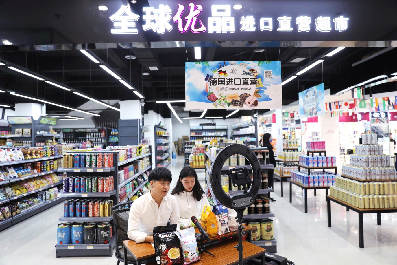銷售人員在曹魏古城南城門的中德跨境購物中心直播。本報記者 喬利峰 攝
