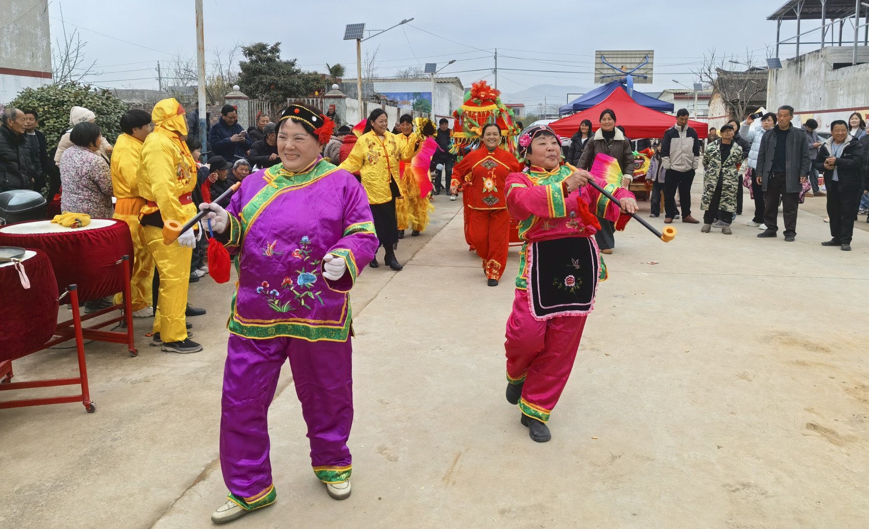 當(dāng)天是村里一年一度的傳統(tǒng)廟會(huì)。伴隨著鏗鏘的鑼鼓聲,舞龍隊(duì)伍從村口騰躍而來(lái),金鱗在陽(yáng)光下閃閃發(fā)光;秧歌隊(duì)的大娘們踩著鼓點(diǎn)扭得歡實(shí),紅綢帶甩得噼啪響。孩子們舉著糖葫蘆在人群里鉆來(lái)鉆去,叫賣聲、談笑聲、鑼鼓聲混合在一起,把這個(gè)千年古村攪得熱氣騰騰。