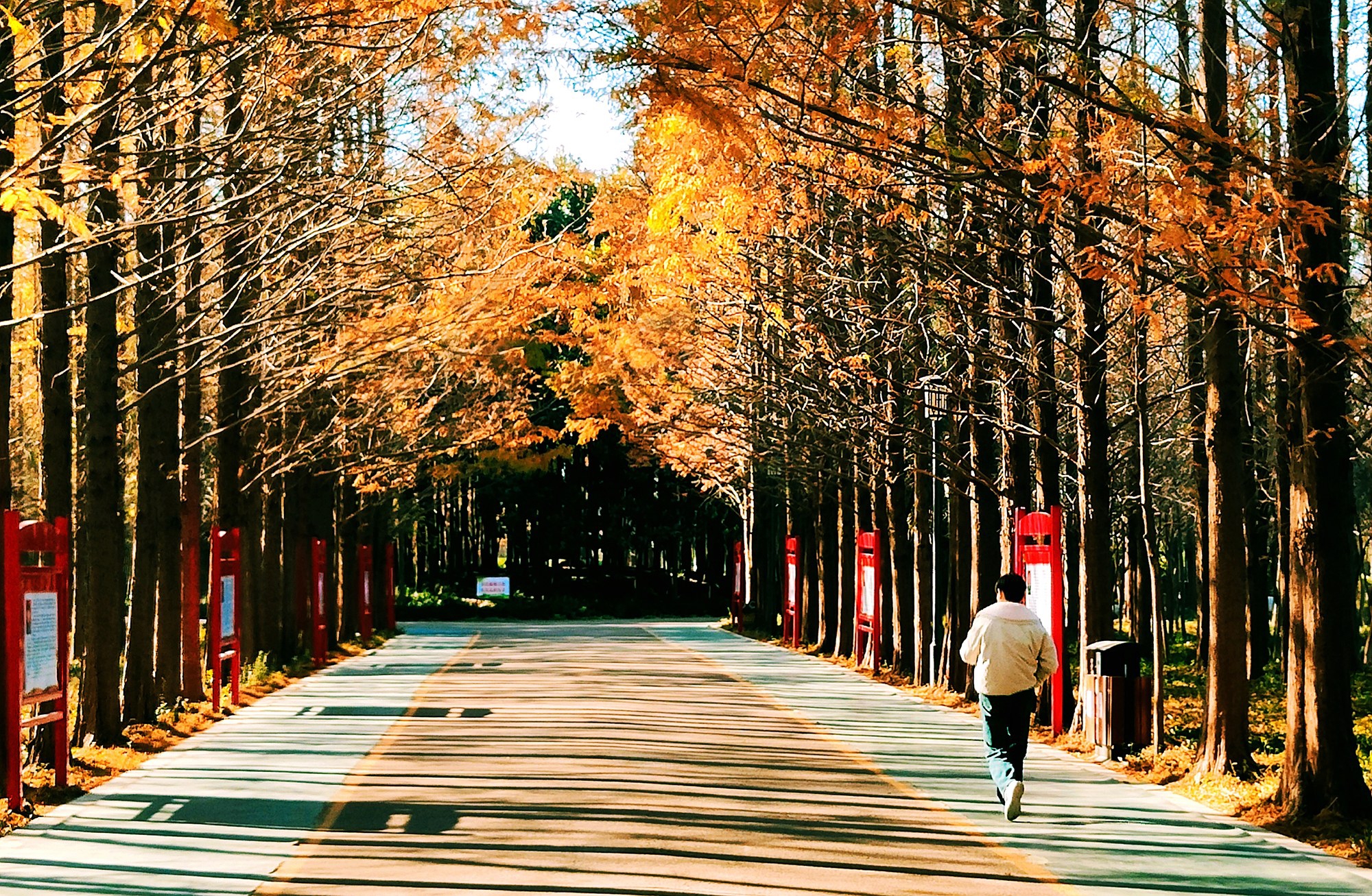 清潩河岸畔的色彩最是濃烈。水杉褪去青衫,舉著一樹樹酡紅的火焰,陽光穿過枝葉,在步道上灑下跳動的光斑。不遠處的粉黛亂子草仍留著最后一抹柔粉,風過時如霧似紗,與水杉的艷紅相映,為蓮城的冬日織就錦繡。