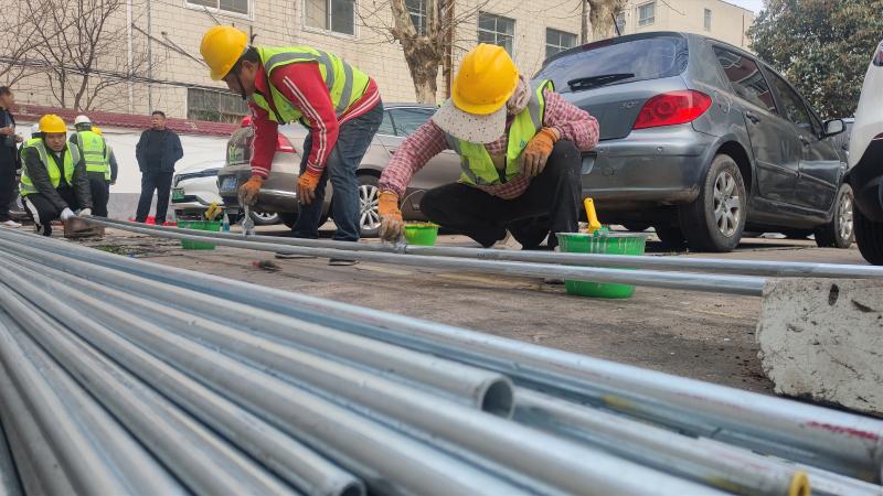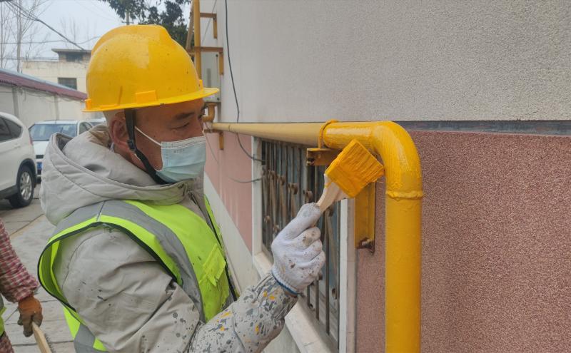 首批小區(qū)燃?xì)飧脑扉_始施工,工作人員正在進(jìn)行立管安裝、刷漆、切割、焊接等作業(yè)。